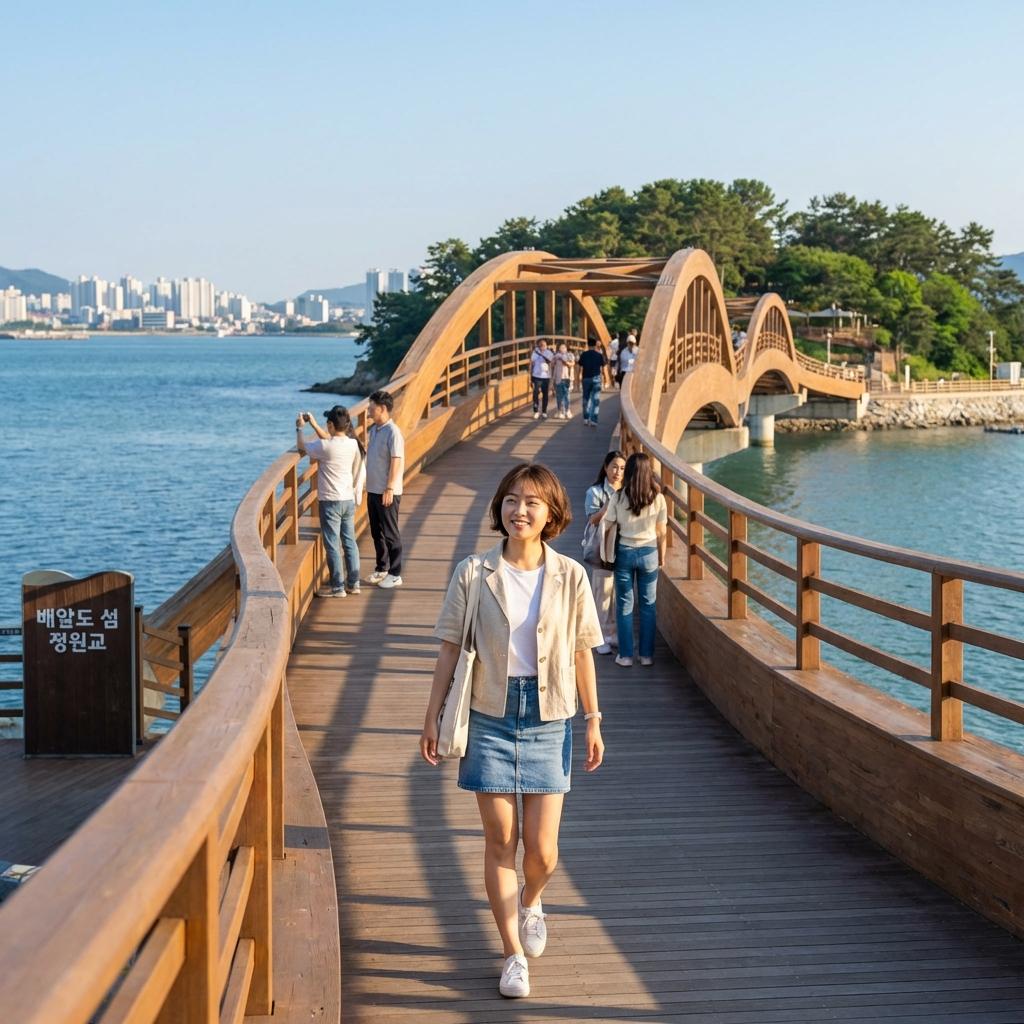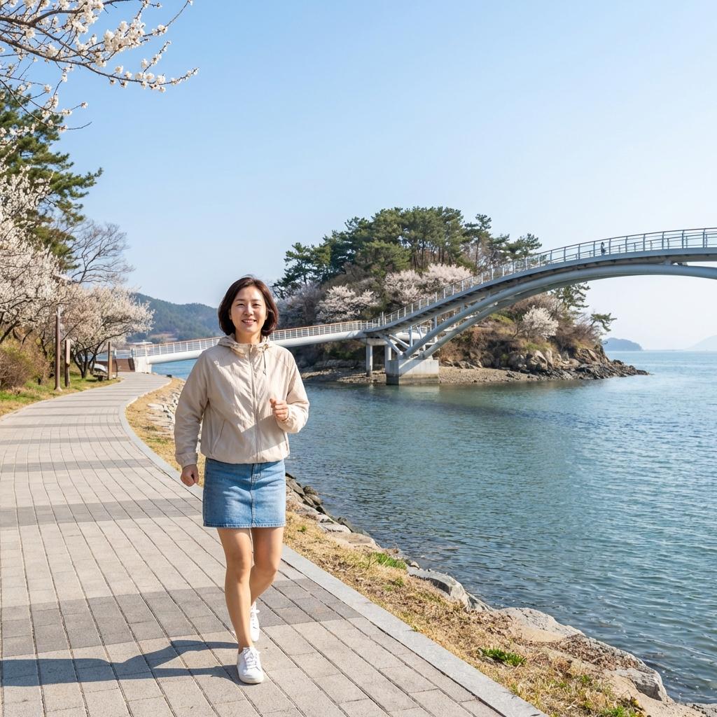짚와이어를 타고 내려온 뒤 도착하게 되는 배알도 수변공원은 '무장애 관광지'로 조성되어 있습니다. 섬과 육지를 잇는 보도교는 계단이 없는 평탄한 데크 길로 되어 있어 휠체어나 유모차 이용객도 불편함 없이 섬 전체를 한 바퀴 둘러볼 수 있습니다. 부모님과 함께 조용히 남해의 파도 소리를 들으며 힐링하기에 최적의 장소입니다.